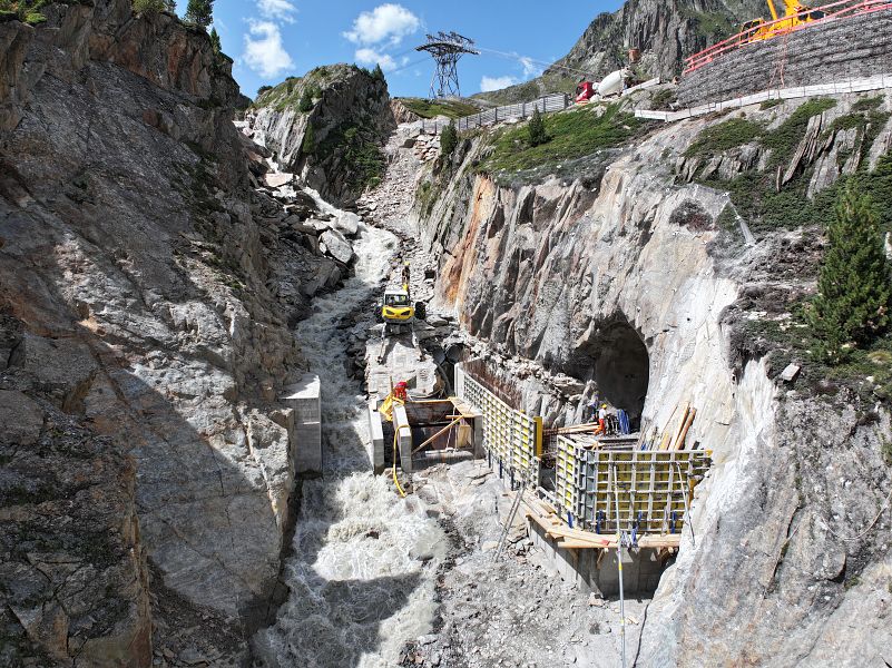 Nach den regenreichen Sommermonaten kam der Erdbau im Herbst sehr gut voran. Im Durchlaufbetrieb konnte bis Mitte Oktober eine Schütthöhe von -15 m unterhalb der späteren Dammkrone erreicht werden. Bei günstiger Witterung erreicht der Damm mit Ende der Schüttsaison 2025 die endgültige Höhe von 2145 m ü. A. Von Betonbau-Seite wurde die luft- seitig des Dichtkerns befindliche Sperrmauer im Gleichlauf zur Schüttung nach oben gezogen.