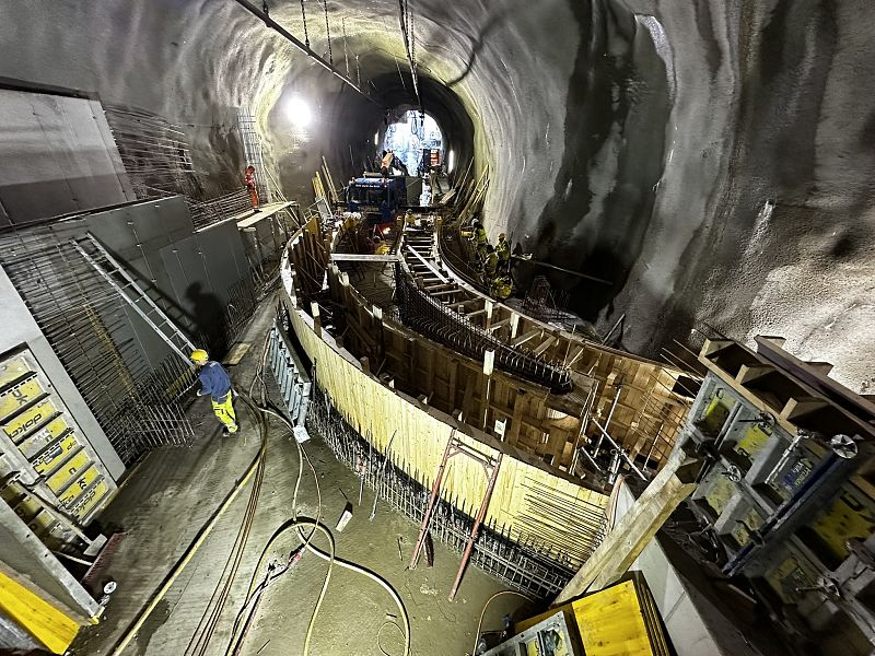 Mitte Mai wurde mit der Errichtung des Abzweigbauwerkes im Unterwasser der Turbinen begonnen. In diesem Bauwerk erfolgt die Überführung der von den beiden Maschinensätzen kommenden Triebwasserwege in den runden Unterwasser-stollen. Über 60 Tunnelmeter werden die Querschnitte auf-geweitet, abgeknickt und wieder auf einen Rundquerschnitt verzogen – mithilfe hochwertigster Schalzimmererarbeiten.